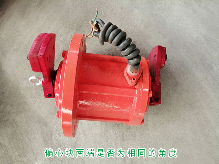 拆除倉壁振動器振動電機防護罩后旋松外側偏心塊,加緊螺栓使兩側偏心塊向同方向轉動,使電機軸上的上刻線對準偏心塊激振力示值線至需要的數(shù)值處,并檢查偏心塊兩端是否為相同的角度。