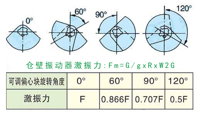 倉壁振動器上的振動電機分為固定偏心塊和可調偏心塊,通過調節(jié)兩端偏心塊之間的夾角改變激振力大小。設備出廠時偏心塊之間的夾角為0度,可將激振力大小調整為相對應的可調偏心塊旋轉角度60度 、90度 、120度對應激振力大小分別為0.866 、0.707 、0.500。