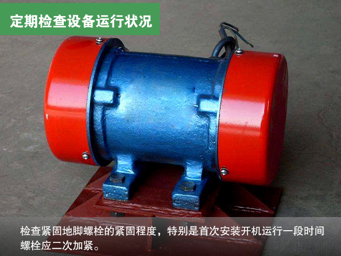 需要定期對(duì)倉(cāng)壁振動(dòng)器進(jìn)行運(yùn)行檢查,仔細(xì)查看整個(gè)設(shè)備在運(yùn)行時(shí)是否會(huì)發(fā)出異常響聲,如果發(fā)現(xiàn)問題必須馬上關(guān)閉電源查看問題源頭出在哪里,同時(shí)檢查緊固地腳螺栓的緊固程度,特別是初次安裝開機(jī)運(yùn)行一段時(shí)間螺栓應(yīng)二次加緊。