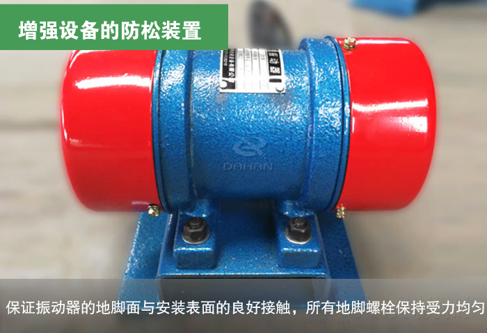 增強(qiáng)倉(cāng)壁振動(dòng)器的防松裝置的安裝,防止設(shè)備在工作使用時(shí)出現(xiàn)配件掉落的情況。保證振動(dòng)器的地腳面與安裝表面的良好接觸,所有地腳螺栓保持受力均勻。